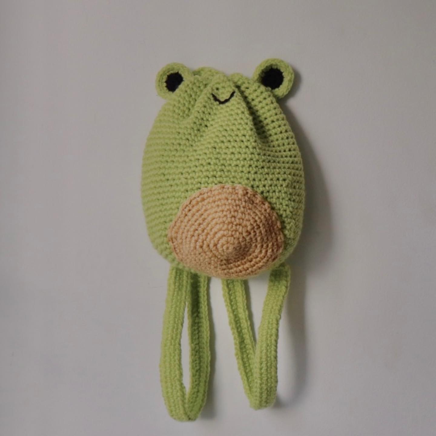 Frog-shaped suitcase with a ribbon closure. Dimensions: 24cm long x 22cm wide.