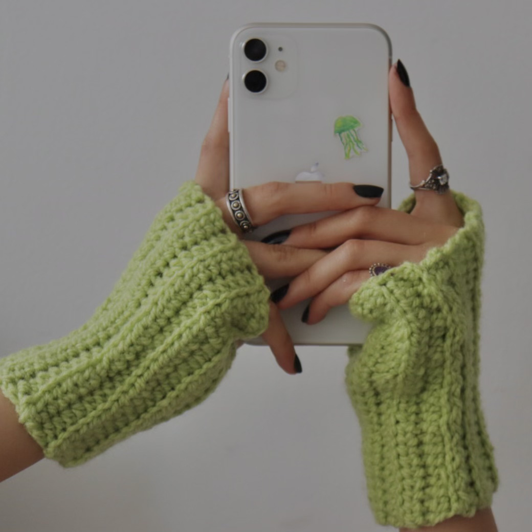 Plain-colored fingerless crochet mittens.