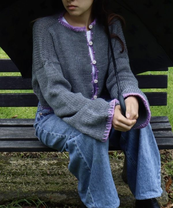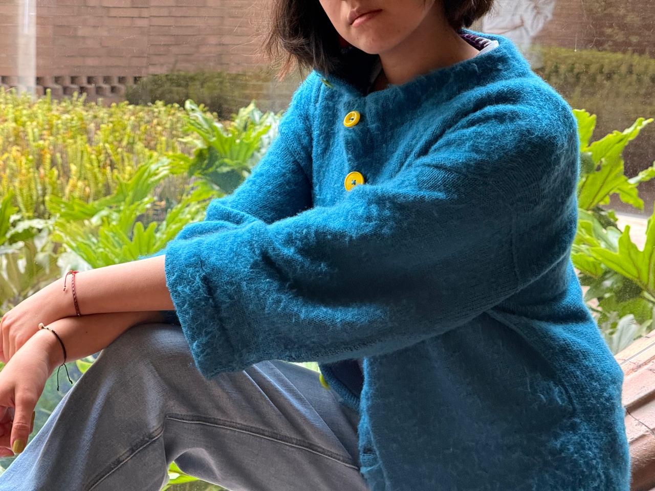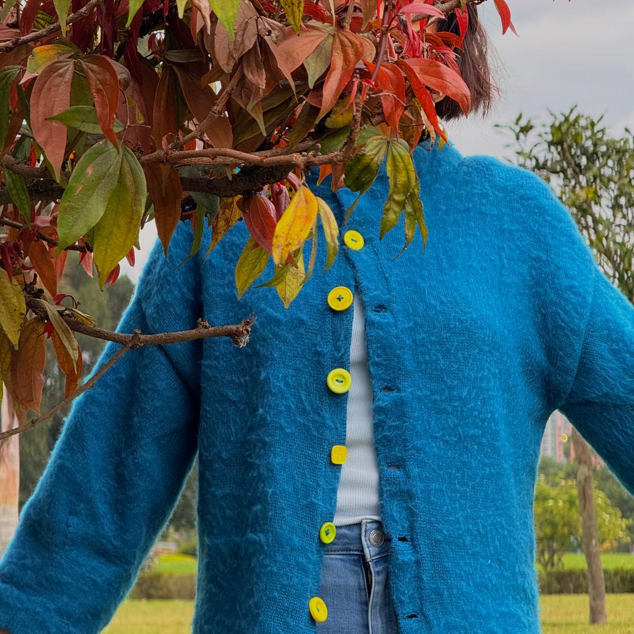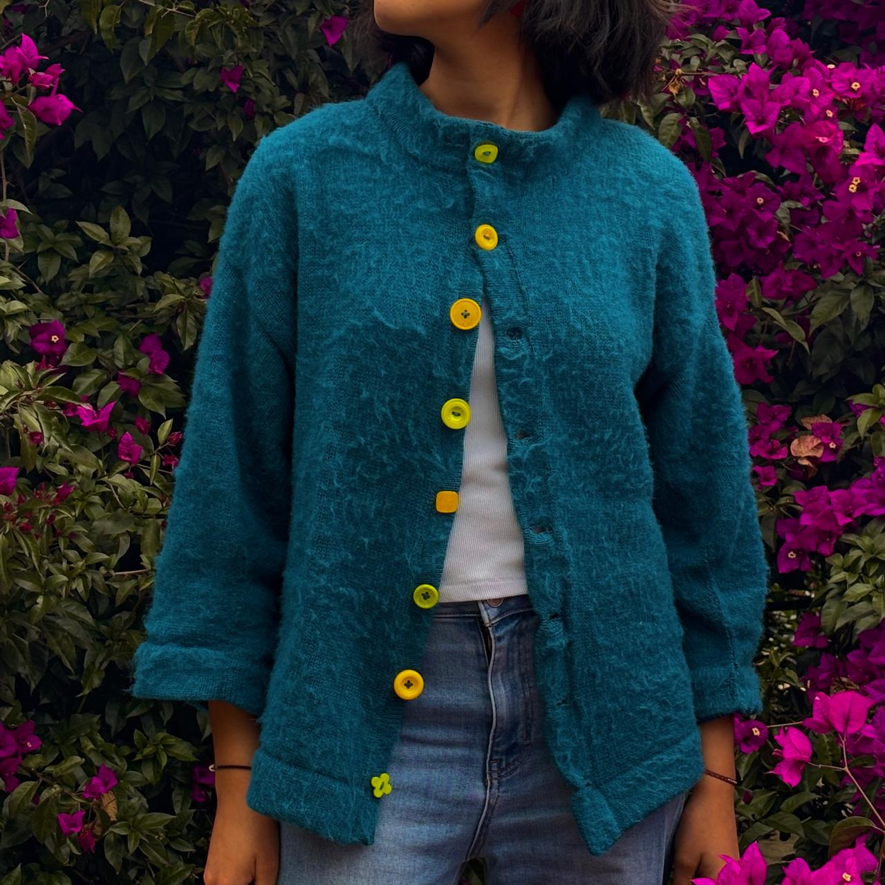 Suéter abierto color azul petróleo, con cuello amplio, manga ¾ amplia, tiene ocho botones con combinación únicas para cada prenda.